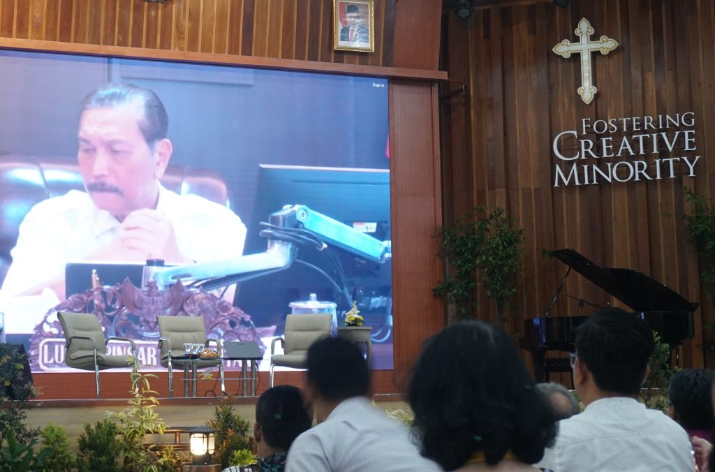 Menko Bidang Kemaritiman dan Investasi Jend. TNI (HOR) (Purn.) Luhut Binsar Pandjaitan menyampaikan keynote speech melalui Zoom