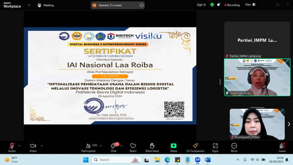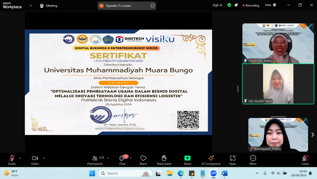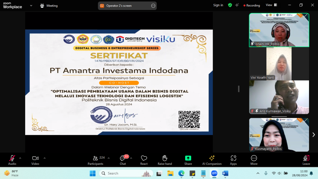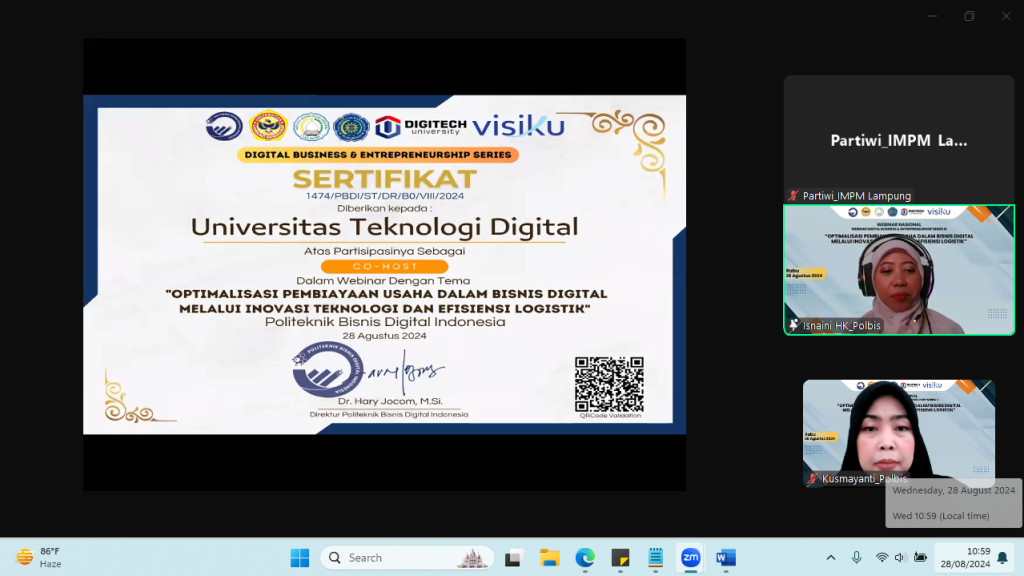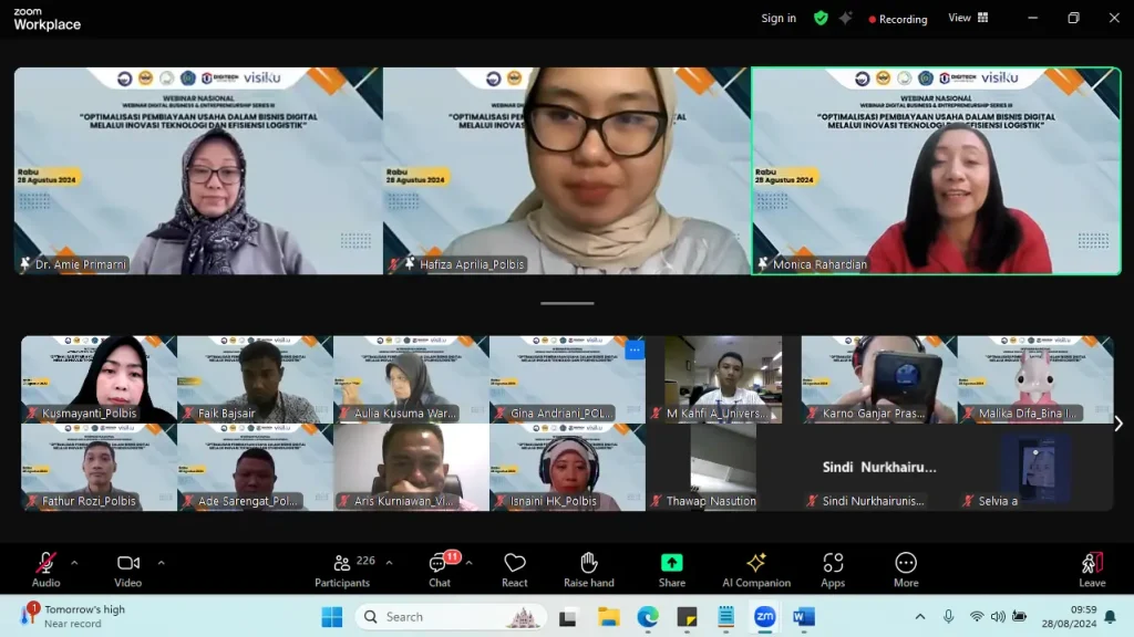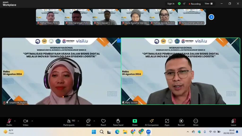 Bogor, 28 Agustus 2024 – Politeknik Bisnis Digital Indonesia kembali menyelenggarakan Webinar Nasional dalam rangkaian Digital & Entrepreneurship Series yang ketiga dengan tema “Optimalisasi Pembiayaan Usaha dalam Bisnis Digital melalui Inovasi Teknologi dan Efisiensi Logistik.” Webinar ini merupakan kolaborasi antara 3 (tiga) program studi di Politeknik Bisnis Digital Indonesia dengan beberapa institusi pendidikan tinggi dan dunia industri, yaitu Universitas Lambung Mangkurat, IAI Nasional Laa Roiba, Universitas Teknologi Digital, Universitas Muhammadiyah Muara Bungo, dan PT Amantra Investama Indodana.