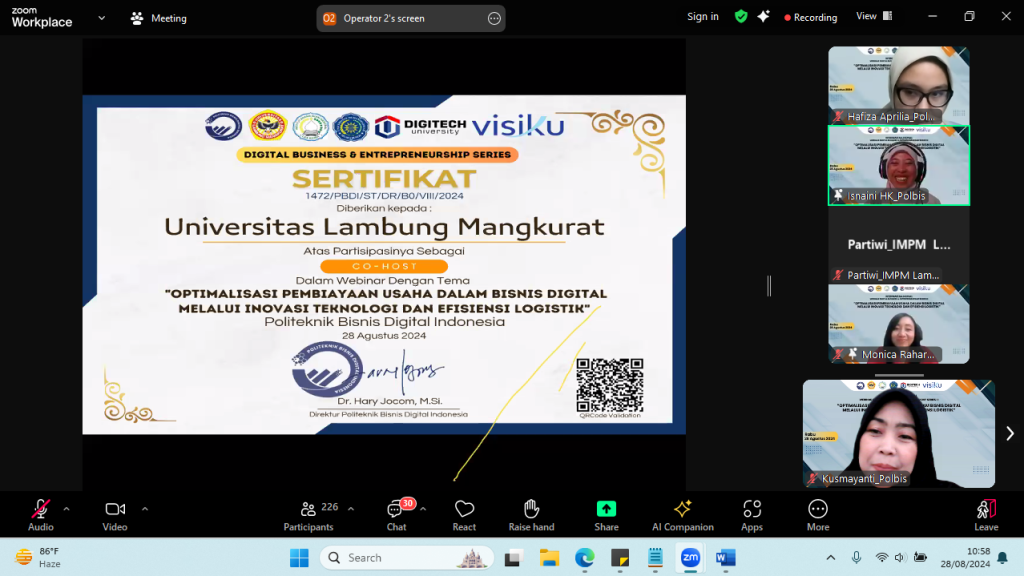 Webinar yang diselenggarakan secara daring pada 28 Agustus 2024 ini diikuti oleh 246 peserta dari berbagai daerah yang terdiri dari 36 perguruan tinggi, sekolah, instansi pemerintah, dunia usaha/dunia industri (DUDI), komunitas, dan masyarakat umum, menunjukkan antusiasme yang tinggi terhadap topik pembiayaan usaha dalam era digital.