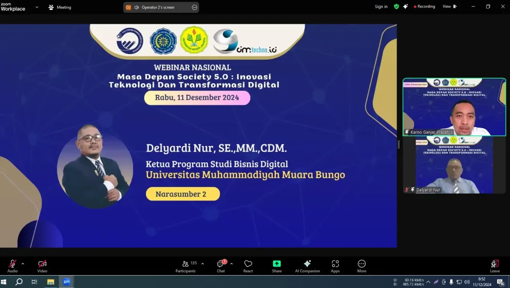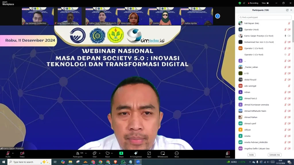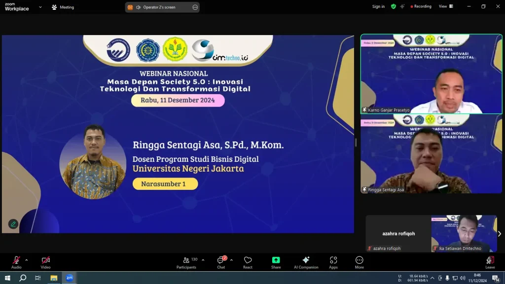 Webinar Nasional bertajuk “Masa Depan Industri 5.0: Inovasi Teknologi dan Transformasi Digital” yang dimoderatori oleh Bapak Karno Ganjar Prasetyo, M.Kom., menghadirkan tiga orang narasumber yang berasal dari akademisi dan praktisi dari dunia industri. Mereka yaitu Bapak Delyardi Nur, S.E., M.M., CDM selaku Kepala Program Studi Bisnis Digital Universitas Muhammadiyah Muaro Bungo Jambi, Bapak Ringga Setagi Asa, S.Pd., M.Kom selaku dosen Universitas Negeri Jakarta, dan Bapak Ika Setiawan, M.Kom., sebagai founder CV. Digital Mandiri Technology.